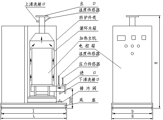GTG30主要由感應(yīng)加熱的主機、循環(huán)水箱、防護外殼組成一體,主機系一種特殊結(jié)構(gòu)的水冷干式短路變壓器,它設(shè)置在循環(huán)水箱內(nèi)。電鍋爐與PLC電控箱安裝在同一底座上,固定式結(jié)構(gòu),見圖8所示。